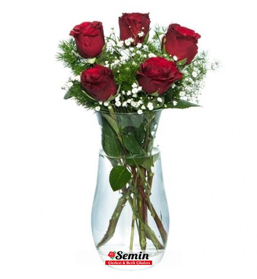 Cam vazoda hazırlanmış 5 adet Kırmızı Gül aranjmanı.